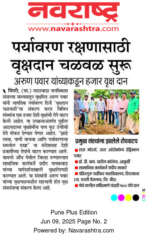 🌳वृक्षमित्र अरुण पवार यांच्या वाढदिवसानिमित्त नागरिकांसाठी विशेष उपक्रम ! मोफत स्मार्ट कार्ड सेवा - आता तुमच्या साठी !वाढदिवस विशेष म्हणून वृक्षमित्र अरुण पवार यांच्या संकल्पनेतून नागरिकांसाठी मोफत सेवा सुरू करण्यात आली आहे : मतदान कार्ड , आयुष्यमान भारत कार्ड , आधार कार्ड यांचे स्मार्ट कार्ड मोफत करून देण्यात येणार आहे.योजनेचा शुभारंभ आज योगशिक्षक , एक्टरेस , चित्रपट , धुमस , दिल बेधुंद , फांजर , अनेक सिरीयल , माझी विठू माऊली , माझी रेणुका माऊली , क्राइम पेट्रोल , लय भारी कारभारी , शॉर्ट फिल्म धाडस अभिनेत्री साक्षी चौधरी, गुरुवर्य माऊली योगा टीचर खैरनार व त्यांच्या सहकाऱ्यांच्या उपस्थितीत उत्साहात पार पडला. या वेळी त्यांचा श्री ज्ञानेश्वरी व तुकाराम गाथा ग्रंथ देऊन सन्मानपूर्वक सत्कार करण्यात आला, ही एक अध्यात्मिक आणि सांस्कृतिक परंपरेला जोडणारी भावना होती."यावेळी मोठ्या संख्येने नागरिक उपस्थित होते.ही मोफत सेवा: 👉 आजपासून 13 ऑगस्ट 2025 पर्यंत 🕘 दररोज सकाळी 9 ते सायंकाळी 6 या वेळेत उपलब्ध आहे.आपले कागदपत्र घेऊन वेळेत या आणि या उपक्रमाचा लाभ घ्या! 🙏 ही लोकहितार्थ योजना असून सर्व नागरिकांनी याचा लाभ घ्यावा, ही विनंती! – वृक्षमित्र अरुण पवार