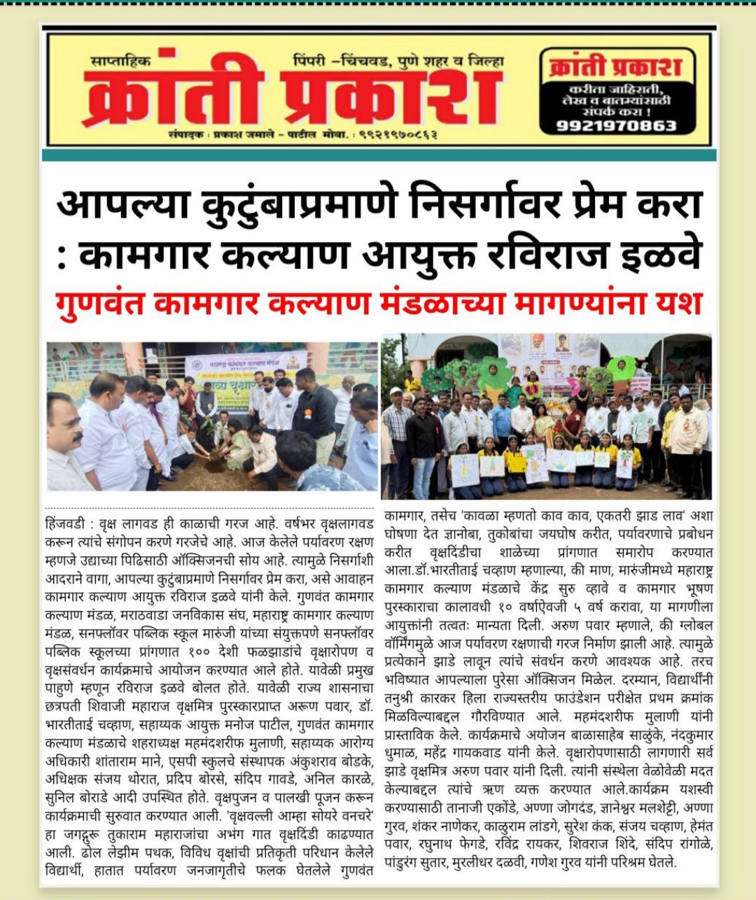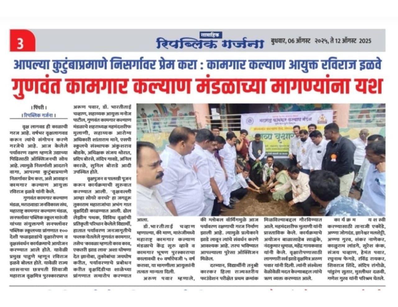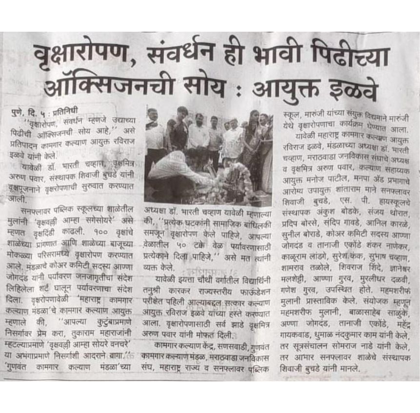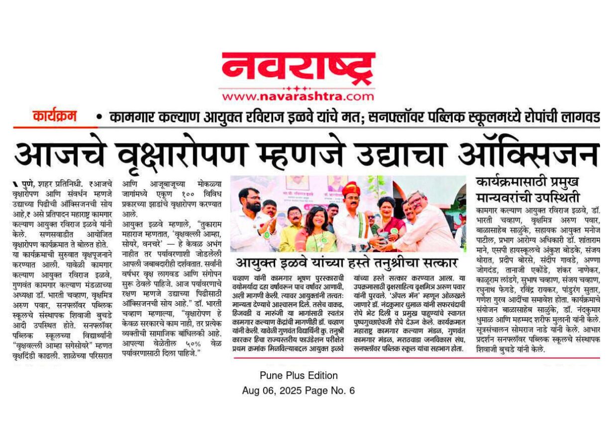 शनिवार,दि :- २ ऑगस्ट २०२५ रोजी, सनफ्लॉवर पब्लिक स्कूल, मारूंजी येथे महाराष्ट्र कामगार कल्याण मंडळ, गुणवंत कामगार कल्याण मंडळ, मराठवाडा जनविकास संघ (महाराष्ट्र राज्य) व सनफ्लॉवर पब्लिक स्कूल यांच्या संयुक्त विद्यमाने एक प्रेरणादायी वृक्षारोपण अभियान यशस्वीरित्या पार पडले.या अभियानामागील हेतू केवळ झाडे लावणे नव्हता, तर निसर्गाशी आपली नाळ जोडणे आणि भविष्यासाठी हिरवा विचार रुजवणे हा मुख्य उद्देश होता. कार्यक्रमाची सुरुवात खास पाहुण्यांच्या उपस्थितीत उत्साहात झाली. सर्व मान्यवर, शिक्षक, अधिकारीवर्ग, विद्यार्थी व वृक्षमित्र मोठ्या संख्येने उपस्थित होते. सर्वांनी एकत्र येऊन वृक्षपूजन केले व नंतर पवित्र अशा वृक्षपालखीचे आयोजन करण्यात आले. त्यानंतर सर्वांनी एकत्र येऊन शाळेच्या परिसरात विविध प्रकारच्या झाडांची लागवड केली. या अभियानाच्या माध्यमातून पर्यावरणसंवर्धनाचे महत्व पटवून देण्यात आले. विद्यार्थ्यांनी सृजनशील पद्धतीने सहभाग नोंदवून एक आदर्श उदाहरण घालून दिले. कार्यक्रमात सर्व मान्यवरांचा सत्कार करण्यात आला. कार्यक्रमाच्या यशस्वी आयोजनासाठी सर्व आयोजक, वृक्षमित्र, शिक्षकवर्ग, अधिकारी आणि विद्यार्थी यांनी अतिशय मोलाचे योगदान दिले. त्यांच्याविषयी मन:पूर्वक आभार व्यक्त करण्यात आले. हे वृक्ष केवळ रोवले गेले नाहीत, तर एक नवा संकल्प रुजवला गेला हिरव्या महाराष्ट्राचा आणि स्वच्छ पर्यावरणाचा !